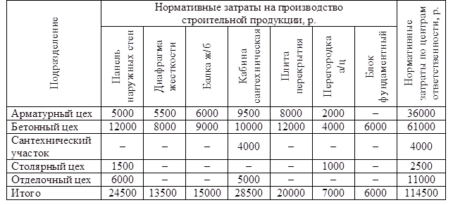 Нормативные затраты на изготовление, например, панелей наружных стен составляют 24500 р., в их изготовлении участвуют арматурный, бетонный, столярный и отделочный цеха. Каждый цех отвечает за определенную операцию. С точки зрения контроля за себестоимостью нет смысла сравнивать фактические затраты в 24500 р. с нормативными, так как четыре разных центра несут ответственность за отклонения. Следовательно, если фактические затраты арматурного цеха превышают нормативные затраты на расходование шести видов продукции, то менеджер этого цеха должен отвечать за всю сумму отклонений. Фактические затраты за тот же период также записываются на счет центра ответственности. Путем сравнения нормативных и фактических затрат выявляют отклонения. К примеру, если фактические затраты на материалы, расходуемые арматурным цехом за период, составляют 38000 р., а нормативные – 36000 р., то отклонение составит 2000 р.