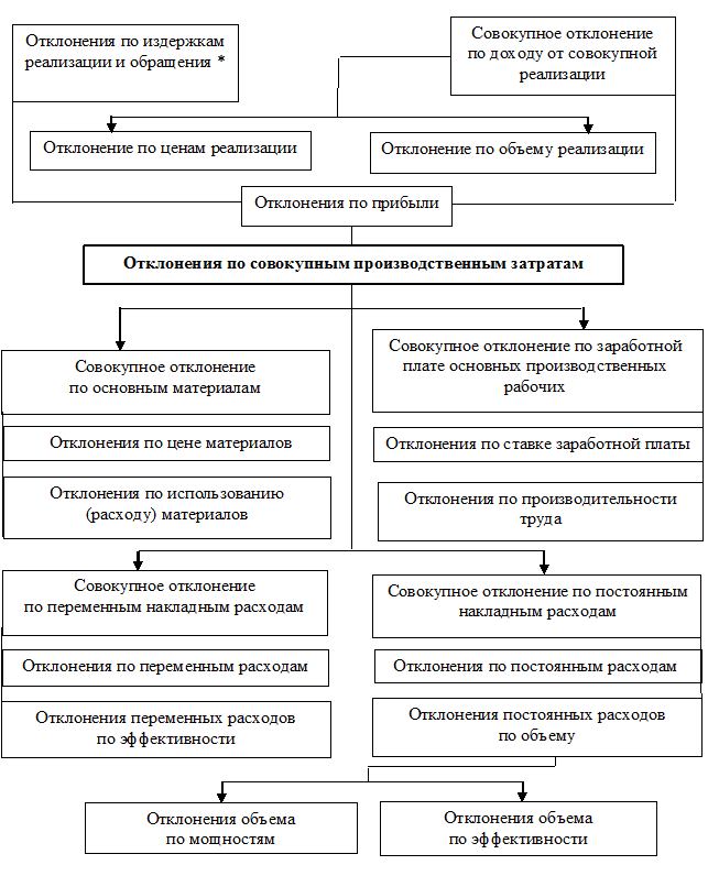 Для расчета данных отклонений использование нормативного месячного объема неприемлемо. При ведении счета товарно-материальных запасов по нормативной себестоимости отклонения расходов считают периодическими затратами (для целей управленческого учета) и относят прямо на себестоимость в течение того периода, когда они возникли. В процессе анализа также исчисляются отклонения трудовых, материальных и производственных накладных расходов. Их арифметическая сумма указывается в отчете.