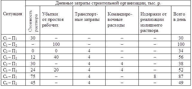 Рассмотрим решение задачи выбора оптимальной стратегии на примере. Строительная организация заключила с заводом железобетонных изделий договор на ежедневную поставку раствора марки М150 на сумму 30 тыс. р. Если в течение дня раствор не поступает, организация несет убытки в размере 100 тыс. р. из-за простоя рабочих. Строительная организация может послать поставщику свой транспорт (дополнительные расходы – 4 тыс. р.), однако опыт показывает, что в 40 случаях из 100 транспорт возвращается ни с чем. Можно увеличить вероятность получения раствора до 80 %, если предварительно послать на завод своего представителя, однако это потребует дополнительных расходов в 4 тыс.р.