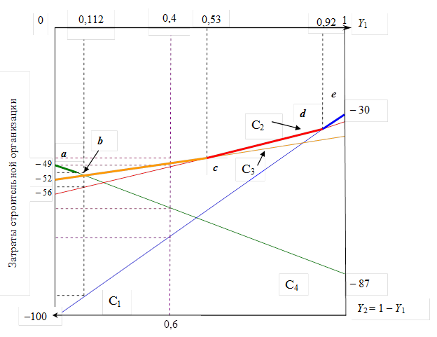 При надежности поставщика Y1 = 0,112 затраты строительной организации максимальны (из всех возможных) при разумном выборе своих стратегий. (Этот максимум зависит от величины затрат, условно выбранных в начале задачи.) Если бы игра была антагонистической, т. е. поставщик стремился нанести строительной организации максимальный ущерб, его оптимальная надежность равнялась бы Y1 = 0,112. При этом затраты строительной организации составили бы – 53,3 тыс. р. и оптимальными были бы стратегии С3 и С4 (точка b находится на пересечении линий С3 и С4).
