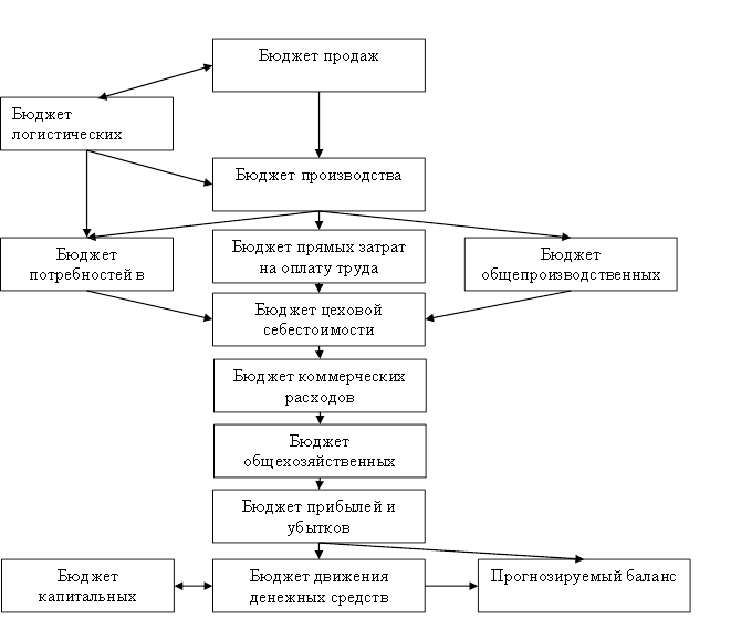 К операционным бюджетам организации отнесены бюджеты продаж, логистических затрат, производства (строительно-монтажных работ), потребностей в строительных материалах, прямых затрат на оплату труда, общепроизводственных расходов, цеховой себестоимости, коммерческих расходов, капитальных вложений. Проводится работа по консолидации бюджетов более низкого уровня управления и согласованию заложенных в них финансовых параметров (рис. 7.8).