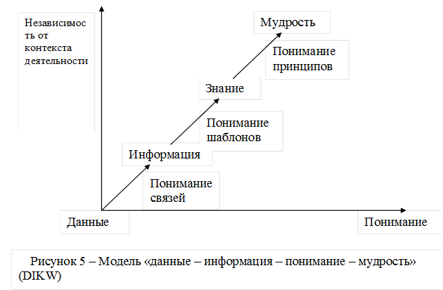 Данные, по Акоффу Р., это неупорядоченные символы, рассматриваемые без относительно к какому-либо контексту. Информация же представляет собой выделенную, упорядоченную часть данных, обработанную для использования. Знание – это формулировка существующих тенденций или сущностных связей между явлениями, представленными в информации. В отличие от своей информационной основы знание может служить руководством для конкретных решений и действий. Понимание есть выражение закономерности, содержащейся во всем множестве разрозненных знаний. Мудрость – это оцененное понимание закономерности с точки зрения прошлого и будущего. Акофф Р. подчеркивает, что если первые четыре компонента процесса формирования знания в сознании индивида имеют дело с прошлым, то мудрость касается будущего.