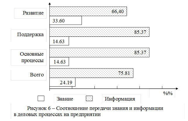 Анализируя данные, представленные на рисунке 6, можно отметить, что в основных процессах деятельности на предприятии взаимоотношения между отдельными субъектами происходят в основной своей массе путем передачи информации, но не знаний. Знания же составляют основной инструмент взаимодействий в процессах развития. То есть, интерпретируя эти данные с точки зрения рассмотренных ранее уровней организации деятельности (таблица 9), можно сказать, что на низшем уровне взаимодействие происходит в основном путем передачи информации. На среднем уровне объем передаваемых во взаимодействиях знаний растет, а на высшем уровне процесс взаимодействия субъектов происходит в основном за счет обмена знаниями.