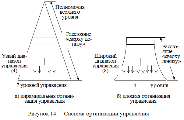 Из содержания рисунка 14 следует, что при пирамидальной организации структуры управления процесс управления растянут по многим вертикальным уровням структуры и число этих уровней не лимитировано. При плоской же диапазон управления расширяется за счет сокращения вертикальных звеньев. Плоская система организации управления с максимальной децентрализацией развивает ориентацию субъектов рынка на использование внутренних возможностей локальной коммуникативной сети.