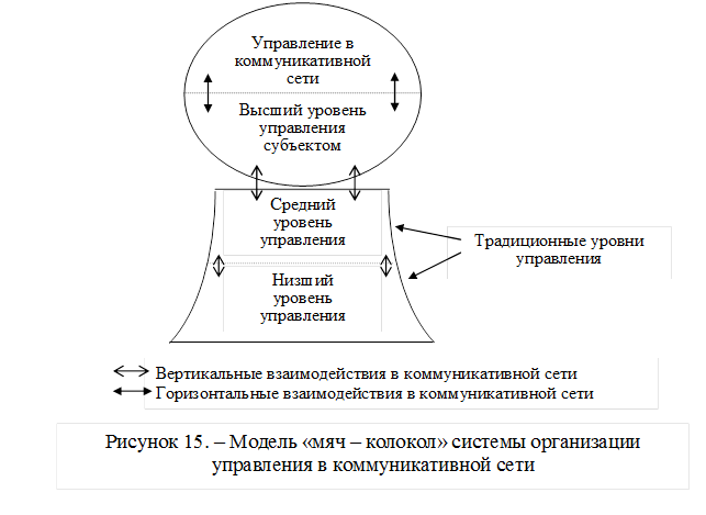 В модели организации системы управления «мяч – колокол» представлен мяч, балансирующий на вершине колокола. Тем самым условно подчеркивается принципиальное направление перераспределения функций управления в коммуникативной сети. Часть из них делегируется во внешние по отношению к субъекту сферы – в локальную коммуникативную сеть, преобразуя тем самым вертикальные взаимодействия внутри субъекта в горизонтальные взаимосвязи в его локальной коммуникативной сети.
