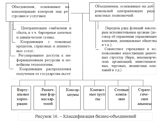 В литературе имеются различного рода классификации бизнес-объединений [например, 10, 43, 72, 83, 114 и др.]. Наиболее обобщенной с точки зрения коммуникативного менеджмента является классификация, предложенная на рисунке 16 [68, 69].