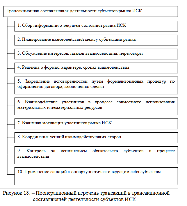 Из представленного на рисунке 18 перечня следует, что упрощенно трансакции можно представить как набор действий участников взаимодействий в рамках заключения сделок с правами собственности на ресурсы и обеспечение их исполнения. Именно в целях придания трансакциям на рынке ИСК должных характеристик формируется его институциональная матрица как набор стабильно воспроизводимых взаимодействий участников рынка.