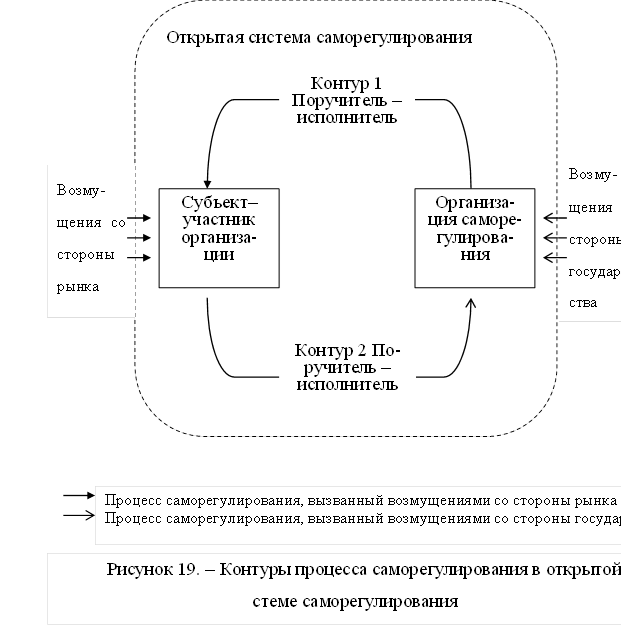 Принципиальным отличием от саморегулирования рынка – действие «невидимой руки» Смита А. (существование только контура 2) – является то, что субъекты-участники, преследуя цель качественного развития своей деятельности на рынке, добровольно наделяют себя обязательствами, имеющими, прежде всего, общественное значение. Примером может служить формирование системы фирменных стандартов для субъектов, входящих в организацию саморегулирования. Кроме того, они делегируют саморегулируемой организации часть своей деятельности, например, по лицензированию или по представительству своих интересов в государственных органах.