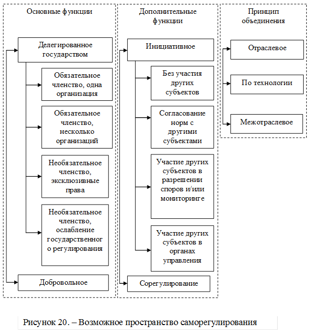 Саморегулирование варьируется от систем полностью инициативных – нормы и правила вырабатываются и защищаются исключительно субъектами-участниками системы– до систем, предполагающих максимально возможное участие государства. Естественно, что как здесь любые формы осуществляются в ограничительных рамках формальных (законодательно принятых) норм, например, общих правил, регулирующих, например, регистрацию объединений, договорные отношения, конкуренцию и т.п., либо специальных, касающиеся именно института саморегулирования, либо норм, регулирующих отрасль или сферу, которые конкретизируются правилами саморегулирования. Указанная конкретизация происходит в направлении дополнения, расширения, ужесточения норм государственного регулирования (рисунок 20).