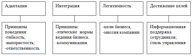 Этические нормы ведения бизнеса, безусловно, повышают эффективность деятельности сотрудника, так как дают ему уверенность в плане выбора того или иного варианта поведения в конкретной ситуации. Функция легитимности реализуется, с нашей точки зрения, через функцию адаптации, поскольку то, насколько компания сможет соответствовать запросам клиентов, и то, насколько этично и корректно она будет вести бизнес, и будет определять отношение к ней других организаций, людей и общества в целом. Позитивный облик компании является безусловным залогом успешности ее деятельности. Таким образом, эффективность компании может быть выражена в следующих ценностных терминах: адаптация, интеграция, легитимность, достижение целей.