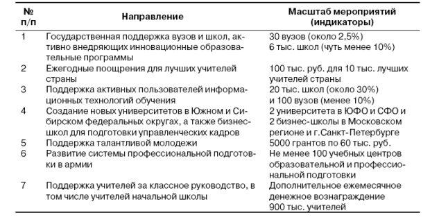 5 сентября 2005 г. президент России Владимир Путин выступил с инициативой реализации четырех национальных проектов, включая проект «Развитие образования». Как и другие национальные проекты, он рассчитан на 2 года (2006–2007 гг.). Проект направлен на государственную поддержку вузов и школ, активно внедряющих инновационные образовательные программы, реализацию программы поддержки лучших учителей, информатизацию образования, поддержку талантливой молодежи, развитие системы профессиональной подготовки в армии, воспитание школьников и др. (Табл. 1.1).