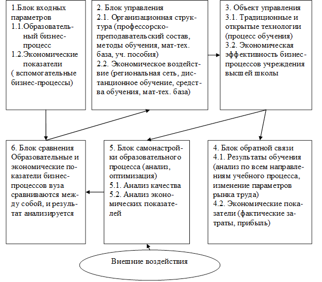 На вход системы управления поступают параметры, характеризующие все планируемые направления учебного процесса (специальности и уровни подготовки, количество студентов, результаты вступительных испытаний, параметры и качество обучения, сроки обучения, образовательные стандарты) и экономические показатели (плановая прибыль, стоимость обучения и др.). Все входные параметры из блока 1 поступают в блок 2, где происходит детализация входных параметров. Этот блок состоит из организационной структуры образовательного процесса и финансовых средств, предопределяющих экономическое воздействие на образовательный процесс. В блоке 2 формируются управляющие воздействия для блока 3 – объекта управления, который представляет собой реально действующий образовательный бизнес-процесс.