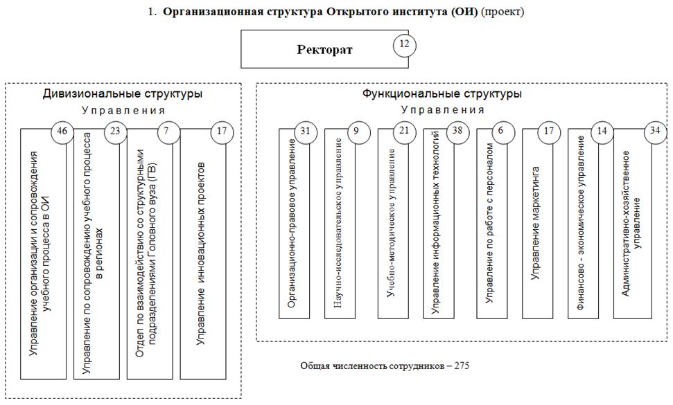 В заключение мы приведем проект организационной структуры организации, занимающейся развитием дистанционного образования на базе определенного вуза – Головного вуза (ГВ) – Открытого института (ОИ).