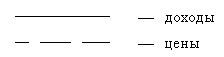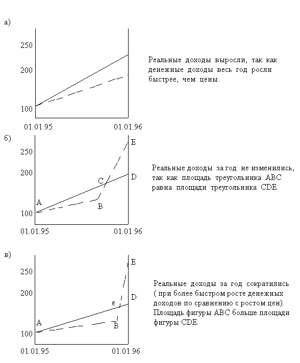 На 1 января 1995 года индекс розничных цен и денежных доходов на душу населения равен 100. На 1 января следующего года эти цифры составили: цены — 200, денежные доходы на душу населения — 250. Можно ли на основании данной информации точно сказать: выросли или упали реальные доходы населения? Задачка может показаться примитивной, но только на первый взгляд. Изменение (динамика) цен и денежных доходов в течение года может быть таким, что ответ будет: а) выросли (кажется очевидным!), б) не изменились, в) снизились!? (см. рис. 4).