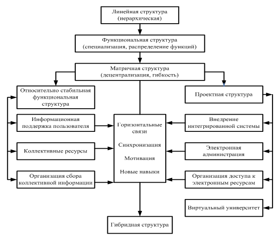 Начиная с конца ХХ столетия высшие учебные заведения, столкнувшись с быстрыми изменениями внешней среды, стали разрабатывать и внедрять новые, более гибкие типы организационных структур, которые по сравнению с традиционными (вертикальными) структурами были лучше приспособлены к быстрой смене внешних условий и появлению инновационных технологий. Такие структуры называются адаптивными, поскольку их можно быстро модифицировать в соответствии с изменениями окружающей среды и потребностями самой организации (рис. 12).