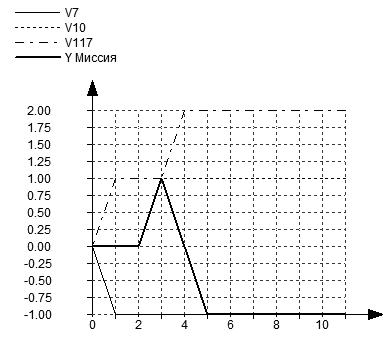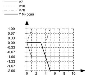 Сценарий №2. В вершину V7 вноситься отрицательное возмущение (q7 = -1). Положительное возмущение q10 = +1 вносится в вершину V10. Соответствующие этому сценарию часть графиков, отображающих возможное поведение системы по выделенным вершинам, изображены на рис. 29.