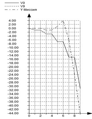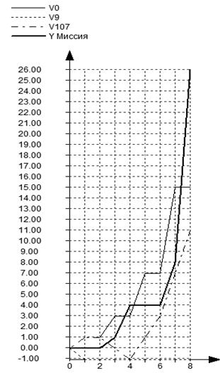 Сценарий №1. Положительное возмущение q0 = +1 вносится в вершину V0 (можно интерпретировать, как положительную направленность действий высшего руководства университета). Соответствующие этому сценарию часть графиков, отображающих возможное поведение системы по выделенным вершинам, изображены на рис. 28.