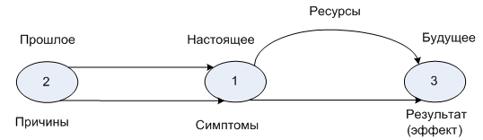 - анализ и описание исходного состояния (выявление слабых мест – симптомов существующей системы управления и определение причин их возникновения – положение 1 и 2 на рис. 3.18);