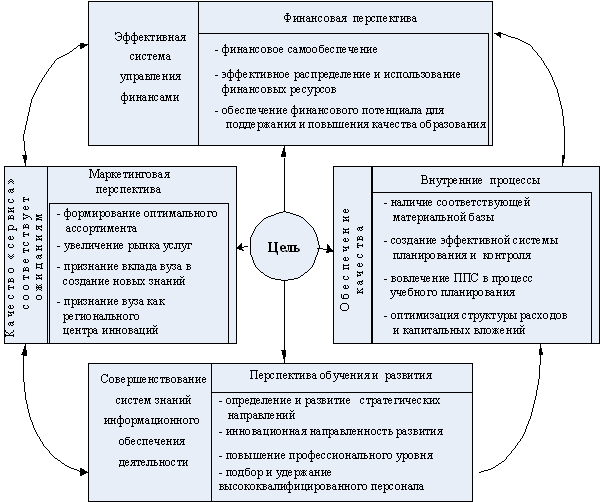 Перспективы обучения и развития (в области персонала, инноваций, финансов и др.). Основной вопрос для анализа: "Как необходимо оптимизировать инфраструктуру или интеллектуальный капитал вуза для достижения целей внутреннего процесса?" Ключевыми составляющими постановки целей в перспективе обучения и роста являются инвестиции в обучение и развитие персонала, во внедрение новых систем качества, разработку оптимальных процессов совершенствования систем знаний и информационного обеспечения.