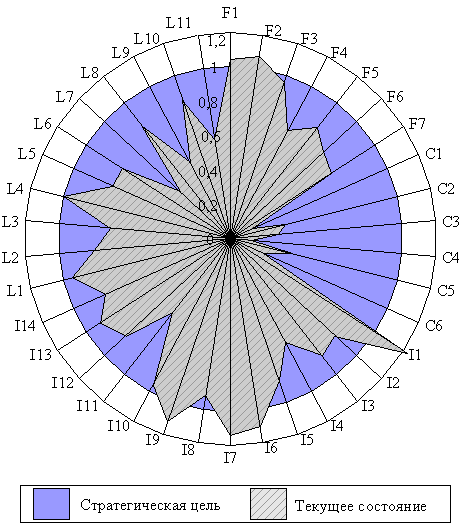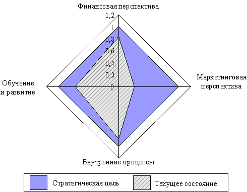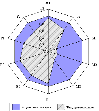 Причем, возможно отображение как текущего состояния нормированных показателей BSC (Wi n от [0; 1]), так и состояния, определенного стратегической целью (Wi n = 1).