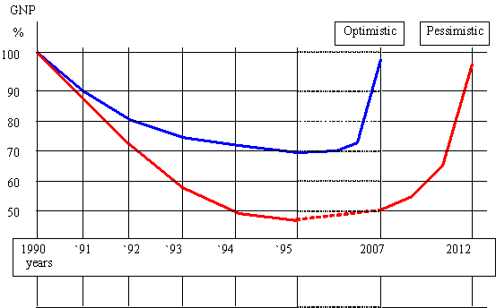 На рис. 3.26 представлен прогноз развития экономического кризиса в России, опубликованный в Российском экономическом журнале в 1993 году.