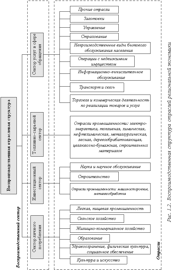 В международной и отечественной практике при анализе динамики воспроизводственной структуры также используется отраслевая структура с разбивкой отраслей народного хозяйства на воспроизводственные сектора: личного потребления, инвестиционный, топливно-сырьевой, услуг в сфере обращения и управления[18]. Распределение всех отраслей хозяйства региона по воспроизводственным секторам представлено на рис.1.2. Результативным показателем исследования региональной институционально-воспроизводственной системы в структурно-отраслевом аспекте выступает произведенный валовой региональный продукт.