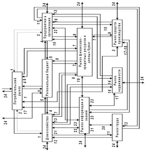 1 – товары и услуги; 2 – денежные средства населения; 3 – оплата товаров и услуг; 4 – ассигнования из бюджета; 5 – прямые и портфельные инвестиции; 10 – выплата процентов и дивидендов; 11 – рабочая сила; 12 – оплата труда; 13 – покупка и продажа недвижимости; 14 – оплата недвижимости; 15 – средства производства; 16 – оплата средств производства; 17 – информация о спросе и предложении товаров, ценах и др.; 18 – информация о сырьевой базе; 19 – информация о банковских процентах и котировке ценных бумаг; 20 – информация о наличии свободных рабочих мест, переподготовки кадров; 21 – информация о новых видах товаров, недвижимого имущества, информация нормативно-правового характера; 22 – информация о поставщиках сырья, потребителях продукции, информация внешнеэкономического характера, научно-техническая, финансово-экономическая, нормативно-правовая; 23 – плата за информационные услуги; 24 – внешние связи.