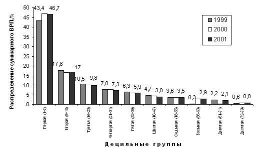 субъектов РФ по децильным группам в 1999–2001 гг., %