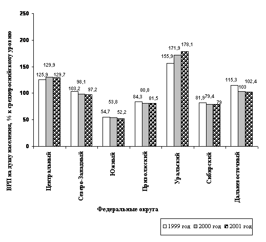Рис. 2.8. ВРП на душу населения по федеральным округам в 1999 – 2001 гг., % к среднероссийскому уровню