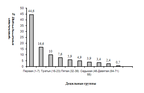 Территориальная структура. Распределение величины используемого ВРП по субъектам Федерации очень неравномерно. При распределении используемого ВРП по децильным группам получаем, что первые две децили (15 регионов) сосредотачивают 61,2% ВРП, а остальные восемь – 38,8% (рис. 2.9). Причем соотношение первой и последней децили по объему используемого ВРП составляет 64 раза, а между субъектами Федерации - 12,9 раз (первое место занимает Москва, последнее - Республика Дагестан).