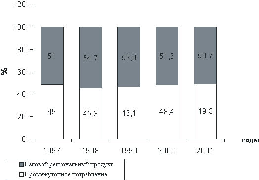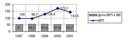 В структуре произведенного ВРП наблюдается увеличение доли сферы производства товаров с 44,1% в 1997 г. до 50,8% в 2001 г. при одновременном уменьшении доли сферы услуг с 50,5% до 43,4, соответственно. Следует отметить, что в структуре ВРП за рассматриваемый период произошли существенные изменения, которые можно разделить на два временных отрезка: