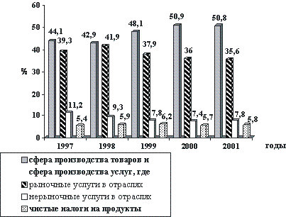Рис. 2.12. Структура произведенного ВРП в 1997–2001гг., в %