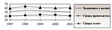 - с 1997 по 1998 гг. преобладает тенденция превышения удельного веса производства услуг над удельным весом производства товаров (в 1997 г. – на 6,4%, в 1998 г. – на 8,3%);