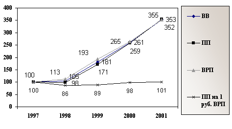 В 1998 г. абсолютная продуктивность достигает нижнего уровня своего падения – 96,7% к уровню 1997 г. (100%) (период финансового кризиса в России), а удельный вес ВРП в ВВ возрастает до максимального значения – 54,7%. Затем экономика вступает в фазу экономического оживления: ее абсолютная продуктивность начинает расти, а относительная продуктивность снижается до 50,7% в 2001 г. Подобная взаимосвязь свидетельствует, во-первых, о том что рыночная структурная трансформация экономики Ростовской области, нацеленная на повышение ее эффективности, под воздействием произведенных институциональных изменений продолжается. Во-вторых, институциональные рыночные преобразования способствовали развитию в регионе комплекса отраслей, выпускающих продукцию с высокой долей добавленной стоимости в валовом выпуске.