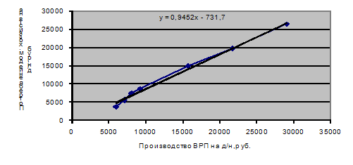 Проанализируем взаимосвязи производства и потребления валового регионального продукта. Проверим статистическую гипотезу о существовании зависимости между величинами среднедушевого производства (Х) и потребления ВРП (У) для Ростовской области в динамике за 1995-2001 гг. с помощью корреляционно-регрессионного анализа. Проверка этой гипотезы подтверждает наличие достаточно сильной положительной зависимости между Х и У (коэффициент корреляции rx,y=0,85), что дает основание для построения модели линейной регрессии: