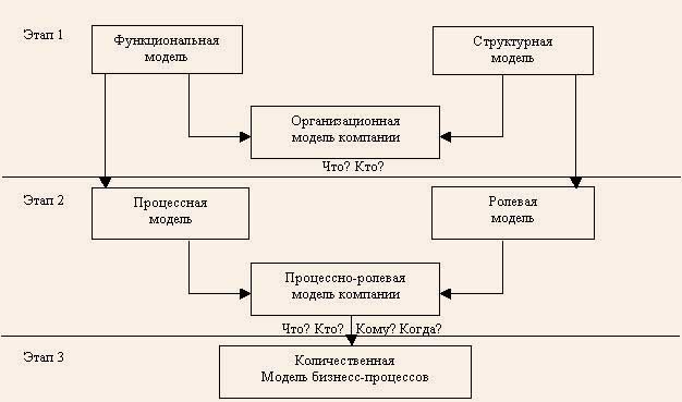 Фактически данную модель можно либо строить с нуля, если фирма - вновь создаваемое образование, либо получить из функционально-структурной модели компании. Для этого необходимо сделать следующее: 1) функциональную модель фирмы трансформировать в процессную модель, 2) структурную модель компании трансформировать в ролевую модель, 3) произвести наложение двух моделей, указанных выше.