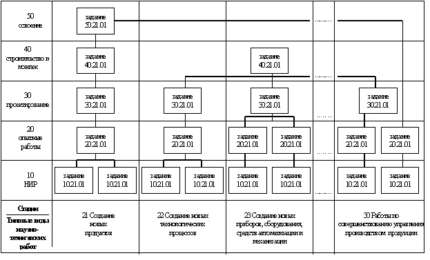 Для удовлетворения этих требований может быть предложена принципиальная схема типовой структуры программы и взаимосвязи заданий в виде матрицы стадий научно-производственного цикла, необходимого для выполнения НТП, и соответствующего ему состава возможных научно-технических работ.[41]