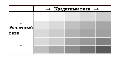 В представленные таким образом (рисунок 8) координаты, представляют собой градацию рисков: – кредитный риск; – рыночный риск; – риск корреляции; – риск процентной ставки; – валютный риск; – товарный риск; – риск кредитного спрэда. Данная матрица наиболее характерна для кредитных организаций, однако она легко поддается трансформации, т.е. для нефинансовых (промышленных и т.д.) корпораций "карту" рисков лучше представлять, имея ввиду координаты коммерческого и «технического» рисков.