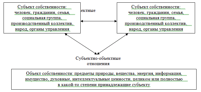 Существующие отношения собственности закрепляются и защищаются государством. Посредством законодательства устанавливаются правовые нормы, которые регламентируют отношения собственности между людьми и в обществе. Вследствие этого отношения собственности приобретают форму юридических отношений, или юридическую форму. А субъекты собственности наделяются правом собственности.
