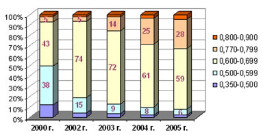 Динамика распределения регионов по индексу качества жизни за 2000–2008 гг. показывает, что наиболее заметные положительные сдвиги произошли в первые годы экономического роста, когда более половины регионов группы с низкими значениями индекса (0,50–0,59) продвинулись в группу, которую можно назвать медианной. Эти изменения связаны не только с ростом экономики, но и с возросшим межрегиональным перераспределением финансовых ресурсов, что привело к росту доходов населения и сокращению бедности. Однако собственные ресурсы таких регионов как были, так и остаются недостаточными для существенного улучшения качества жизни. По этой причине с 2003 г. сдвиг слаборазвитых регионов в сторону более благополучных показателей качества жизни явно замедлился. Одновременно продвинутая часть медианных регионов пополнила группу с более высокими показателями (свыше 0,700). Позитивный сдвиг обусловлен существенным снижением уровня бедности за последние три года и ростом доходов населения, а также устойчивым сокращением младенческой смертности, особенно в регионах ЕвропейскойРоссии (рис.47).