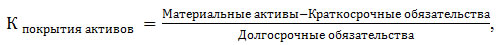 - Коэффициент долгового покрытия активов (asset coverage ratio), характеризующий способность компании погасить свои обязательства за счет имеющихся в распоряжении активов. Рассчитывается как отношение чистых материальных активов к долгосрочным обязательствам.