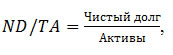 - Отношение чистого долга к активам (net debt to total assets, ND/TA). Чистый долг рассчитывается как сумма обязательств за вычетом денежных средств и их эквивалентов (краткосрочные финансовые вложения).