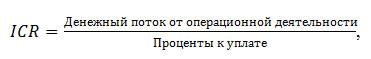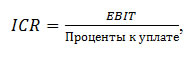 - Коэффициент покрытия процентов (interest coverage ratio, ICR), представляющий собой отношение прибыли до выплаты процентов и налогов (EBIT) к величине процентов к уплате.