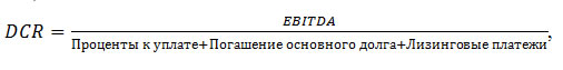 - Коэффициент покрытия фиксированных платежей (debt coverage ratio, debt service coverage ratio, DCR), характеризующий возможность организации формировать соответствующие источники погашения обязательств. При этом в числителе можно использовать как денежный поток от операционной деятельности, увеличенный на величину процентов к уплате и налогов, так и показатель прибыли до выплаты процентов, налогов и начисления амортизации (EBITDA).