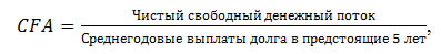 - Коэффициент адекватности денежного потока (cash flow adequacy ratio, CFA), представляющий собой отношение годовой величины чистого свободного денежного потока (net free cash flow, NFCF) к среднегодовой величине долговых платежей за пять предстоящих лет. Использование средней величины платежей по долговым обязательствам позволяет сгладить возможную неравномерность в графике погашения основного долга.
