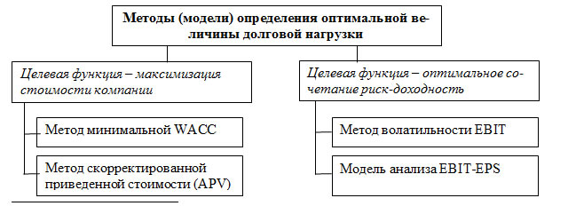 В зависимости от выбранной целевой функции возможны следующие методы количественного обоснования уровня долговой нагрузки и кредитной емкости компании (Рис. 7):
