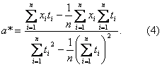 Пример оценивания по методу наименьших квадратов. Пусть даны n=6 пар чисел (tk , xk), k = 1,2,…,6, представленных во втором и третьем столбцах табл.1. В соответствии с формулами (2) и (4) выше для вычисления оценок метода наименьших квадратов достаточно найти суммы выражений, представленных в четвертом и пятом столбцах табл.1.