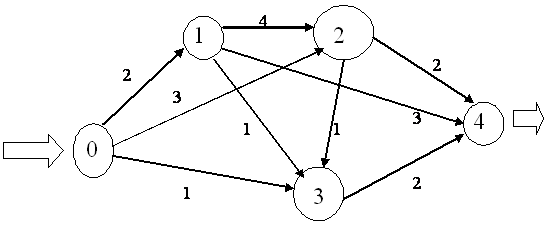 Для решения этой задачи каждой дуге ориентированного графа, соответствующего транспортной системе, должно быть сопоставлено число - пропускная способность этой дуги. Рассмотрим пример (рис.8).