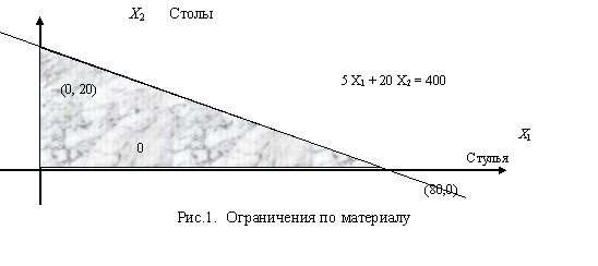 Таким образом, ограничения по материалу изображаются в виде выпуклого многоугольника, конкретно, треугольника. Этот треугольник получается путем отсечения от первого квадранта примыкающей к началу координат зоны. Отсечение проводится прямой, соответствующей второй строке исходной задачи, с заменой неравенства на равенство. Прямая пересекает ось Х1, соответствующую стульям, в точке (80,0). Это означает, что если весь материал пустить на изготовление стульев, то будет изготовлено 80 стульев. Та же прямая пересекает ось Х2, соответствующую столам, в точке (0,20). Это означает, что если весь материал пустить на