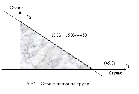 Таким образом, ограничения по труду, как и ограничения по материалу, изображаются в виде треугольника. Этот треугольник также получается путем отсечения от первого квадранта примыкающей к началу координат зоны. Отсечение проводится прямой, соответствующей третьей строке исходной задачи, с заменой неравенства на равенство. Прямая пересекает ось Х1, соответствующую стульям, в точке (45,0). Это означает, что если все трудовые ресурсы пустить на изготовление стульев, то будет сделано 45 стульев. Та же прямая пересекает ось Х2, соответствующую столам, в точке (0,30). Это означает, что если всех рабочих поставить на изготовление столов, то будет сделано 30 столов. Для всех точек внутри треугольника выполнено неравенство, а не равенство - часть рабочих будет простаивать.